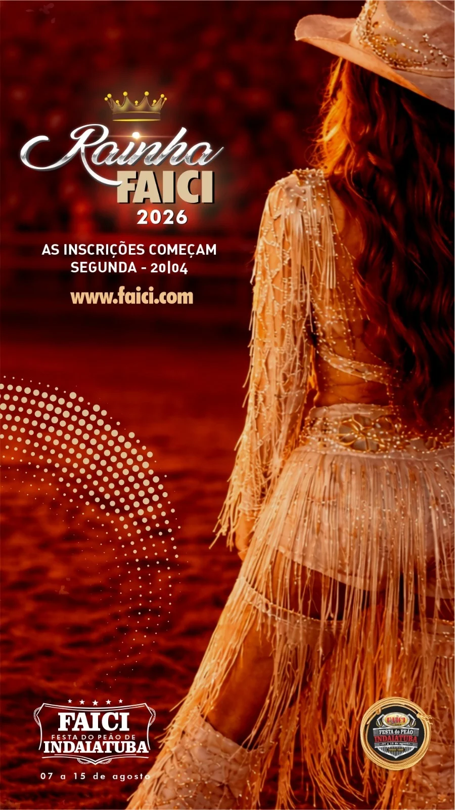 Entre os dias 20 de abril e 15 de maio quem tiver o sonho de ser a Rainha FAICI 2026 pode se inscrever e concorrer ao trono. Assim como no ano passado a corte deste ano será formada pela Rainha FAICI, Princesa e Madrinha. A 37ª edição da Festa do Peão de Indaiatuba acontece entre os dias 07 e 15 de agosto e terá shows de grandes nomes da música sertaneja, além de muito esporte com montarias em touros e provas a cavalos.
