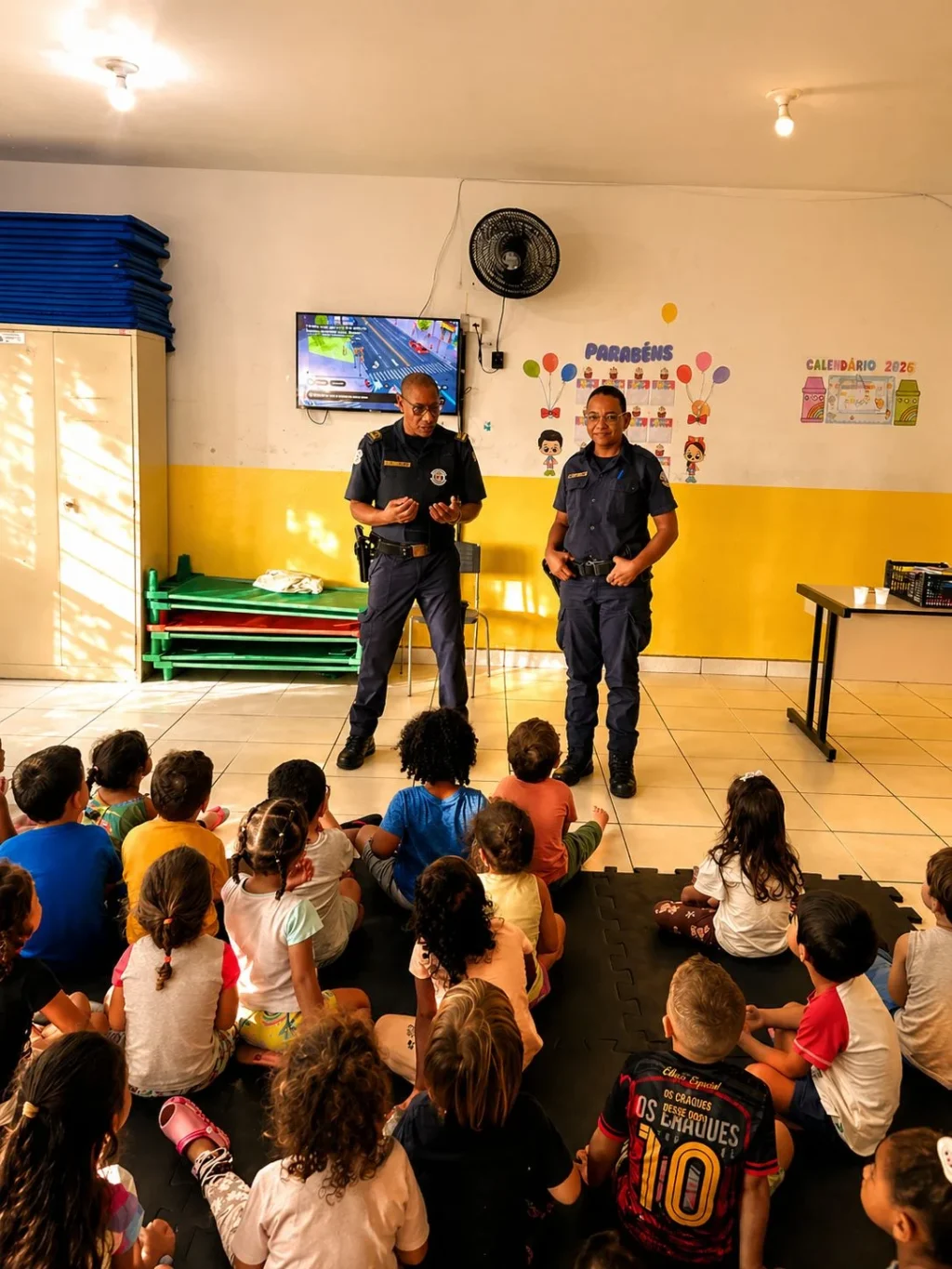 Atendendo ao convite da direção, os agentes Arnaldo e Iraci estiveram no local uniformizados para apresentar às crianças a profissão na área da segurança pública, de forma simples e adequada à faixa etária. Durante a atividade, os alunos também puderam conhecer uma das viaturas utilizadas pela corporação.
