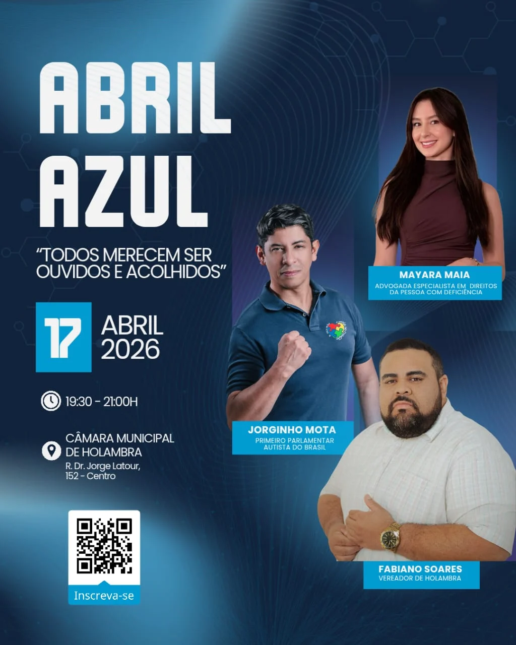 Com o tema “Todos merecem ser ouvidos e acolhidos”, o encontro reunirá especialistas e lideranças que atuam diretamente na defesa dos direitos das pessoas com deficiência. Entre os convidados confirmados estão Jorginho Mota, reconhecido como o primeiro parlamentar autista do Brasil, e a advogada Mayara Maia, especialista em direitos da pessoa com deficiência.
