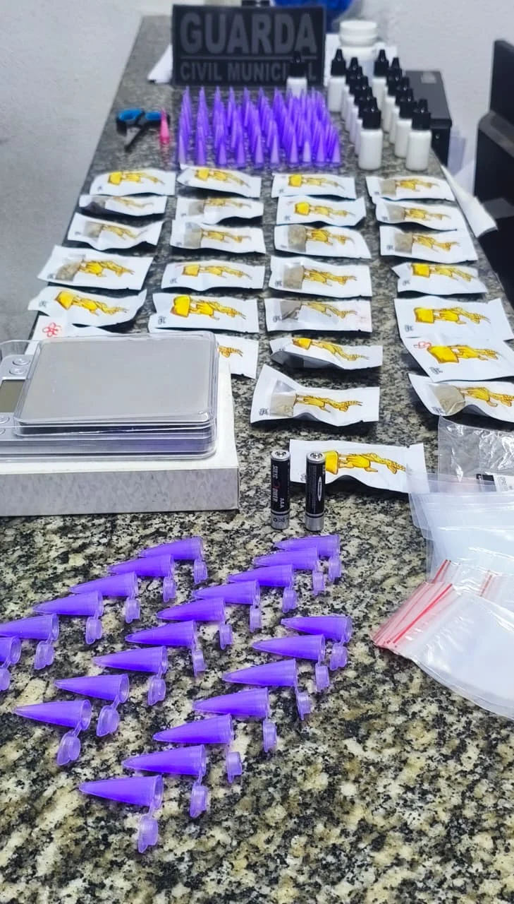 Com autorização, os agentes realizaram buscas no imóvel e localizaram uma mochila contendo 121 porções de cocaína, 27 porções de maconha, 13 frascos de lança-perfume, além de materiais utilizados no preparo e armazenamento das drogas, como balança de precisão, embalagens e substâncias para mistura.