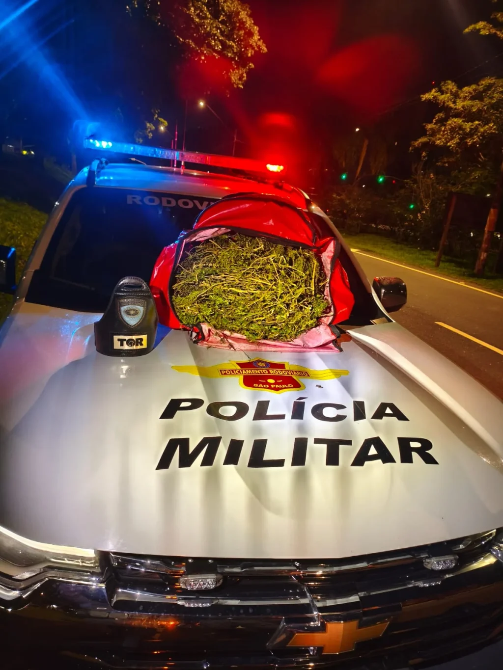 Nada de ilícito foi encontrado na busca pessoal. No entanto, durante a vistoria no veículo, os policiais localizaram no porta-malas uma bolsa carregada com maconha. O passageiro assumiu a propriedade da droga.